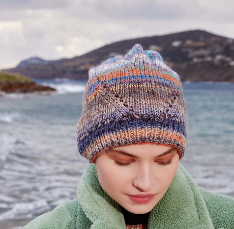 Deze muts is gemaakt met de Infinity van Lang Yarns. Infinity van Lang Yarns is gemaakt van extrafijne merinowol, dat zich onderscheidt door een uniek kleurontwerp. Elke bol is zo gemaakt dat er geen patroonherhaling is. Hierdoor wordt elke muts uniek.