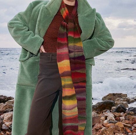 Deze sjaal is gemaakt met de Infinity van Lang Yarns. Infinity van Lang Yarns is gemaakt van extrafijne merinowol, dat zich onderscheidt door een uniek kleurontwerp. Elke bol is zo gemaakt dat er geen patroonherhaling is. Hierdoor wordt elke sjaal uniek.
