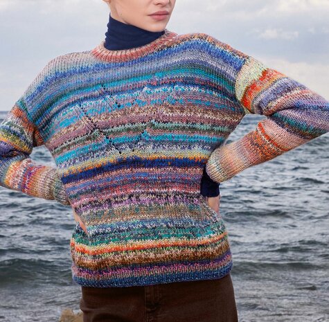 Deze trui is gemaakt met de Infinity van Lang Yarns. Infinity van Lang Yarns is gemaakt van extrafijne merinowol, dat zich onderscheidt door een uniek kleurontwerp. Elke bol is zo gemaakt dat er geen patroonherhaling is. Hierdoor wordt elke trui uniek.