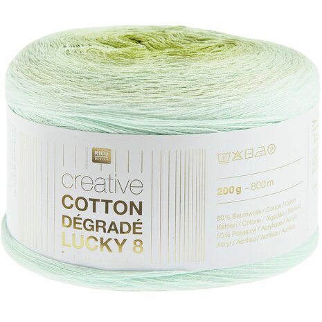 Creative Cotton dégradé Lucky 8 van Rico is een mooie katoen/acryl bol met maar liefst 800 meter op de bol. Het is een kleurverloopbol met maar liefst 8 verschillende kleuren op één bol. Dit maakt het kleurverloop effect spannend!