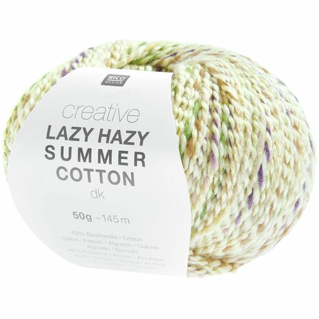 Creative Lazy Hazy Summer Cotton DK van Rico is een draad met een verrassend kleurverloop. De draad bestaat uit twee draden. De kerndraad is een uni kleurige draad en de draad die eromheen gedraaid zit heeft een mooi kleurverloop. De draad geeft gebreid of gehaakt een mooi uiterlijk aan accessoires of kleding.