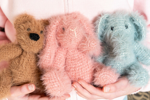 Is het geen schatje? Haas Hester wordt super zacht en knuffelig door het toegevoegde Furry Furry draadje. En met de beweegbare armen en benen, maakt het de haas extra leuk. Afmeting haas zittend: ca. 15cm Benodigde haaknaald: 2,5 mm Dit haakpakket voor haas Hester Fur bestaat uit: 1 patroon 1 bol Scheepjes Catona in de kleur naar keuze 1 restje Catona lichtroze 2 bollen Ricorumi Furry Furry of 1 bol Creative Make it Fur in de kleur naar keuze 1 paar veiligheidsoogjes 8 mm ovaal 4 knopen 15 mm (excl. haaknaald) (excl. vulling) Kleurencombinaties: 1: Furry Furry 007 blauwgrijs en Catona 172 light Silver 2. Furry Furry 007 blauwgrijs en Catona 528 oudgroen 3. Furry Furry 003 roze en Catona 408 oldrose 4. Furry Furry 001 wit en Catona 105 bridal white 5. Furry Furry 008 bruin en Catona 503 hazelnut 6. Furry Furry 002 geel en Catona 403 lemonade 7. Furry Furry 004 oranje en Catona 410 rich coral 8. Furry Furry 006 groen en Catona 515 emerald 9. Furry Furry 009 hout en Catona 254 moon rock 10. Furry Furry 011 zwart en Catona 110 black 11. Furry Furry 005 blauw en Catona 397 cyan 12. Furry Furry 005 blauw en Catona 385 chrystaline