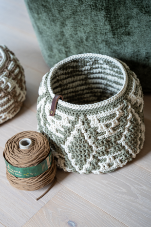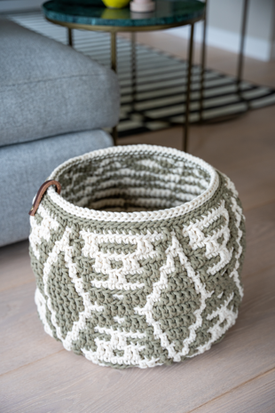 Deze leuke woonmand kun je voor allerlei doelen gebruiken in huis. Haak het met een stevige, rekbare draad geschikt voor haaknaald 8/9. Benodigde haaknaald: 8/9 mm (ligt eraan hoe los of hoe strak je haakt) Afmeting mand: ca. dia 30 cm, hoogte ca. 38 cm Benodigdheden: Een draaddikte geschikt voor naalden 8/9. Een stevige draad, zoals een gerecyclede katoen, Durable Braided of Zpagetti. Benodigde draadlengte van de hoofdkleur is ca. 300 meter en draadlengte voor de contrastkleur is ca. 150 meter.