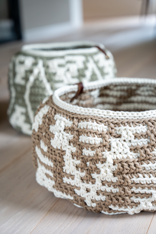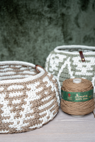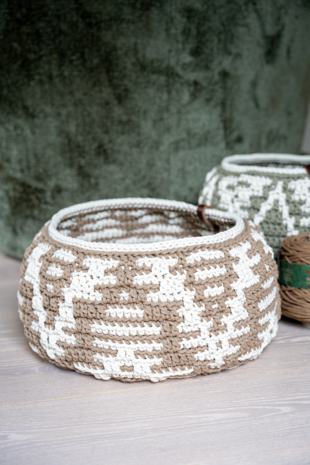 Deze leuke woonmand kun je voor allerlei doelen gebruiken in huis. Haak het met een stevige, rekbare draad geschikt voor haaknaald 8/9. Benodigde haaknaald: 8/9 mm (ligt eraan hoe los of hoe strak je haakt) Afmeting mand: ca. dia 45 cm, hoogte ca. 30 cm Benodigdheden: Een draaddikte geschikt voor naalden 8/9. Een stevige draad, zoals een gerecyclede katoen, Durable Braided of Zpagetti. Benodigde draadlengte van de hoofdkleur is ca. 300 meter en draadlengte voor de contrastkleur is ca. 150 meter.