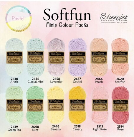 In elk colour pack zitten 12 verschillende mini-bollen Scheepjes Softfun van 20 gram. De 12 zorgvuldig gekozen tinten van de verschillende mini-bollen in elk colour pack vormen samen een prachtig geheel, voor een harmonieus resultaat in je project. Elk colour pack bevat een QR-code die verwijst om een bijpassend haakpatroon te kopen.