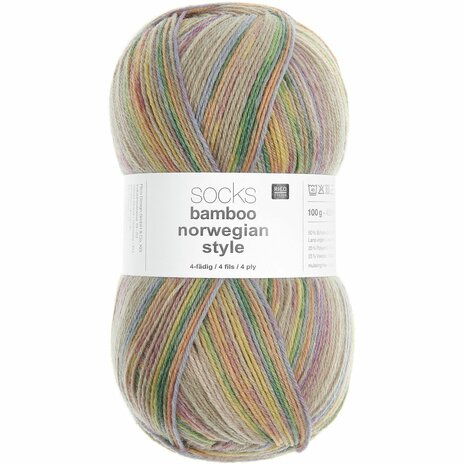 Rico Superba 4-draads Bamboo! Een heerlijk zacht 4-draads sokkengaren gemaakt met wol en bamboe in een zelfstrepende kleureffect. Eén bol is voldoende voor een paar sokken. Maar denk bij dit leuke garen ook aan een leuke omslagdoek of sjaal.